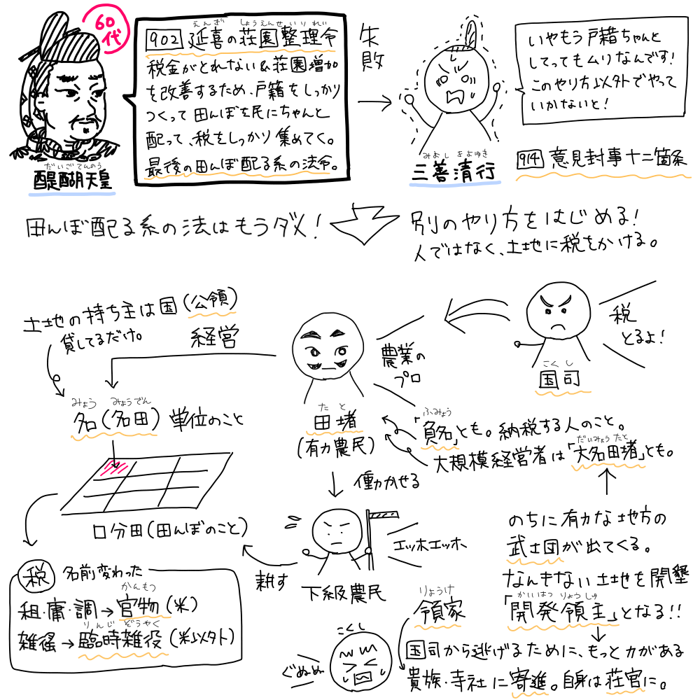 醍醐天皇の時に延喜の荘園整理令(えんぎのしょうえんせいりれい)が出されましたが、これに対し三善清行(みよしきよゆき)が「もう無理だ」と、意見封事十二箇条(いけんふうじじゅうにかじょう)を出します。