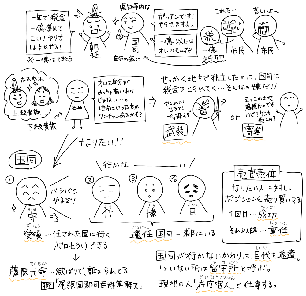 朝廷はお金を必ず一定数集めたい。そこで国司に「一億集めろ。それ以上はお前にやる」的な話をするので、国司視点だといっぱい集めたらその分自分の懐に入れることができます。