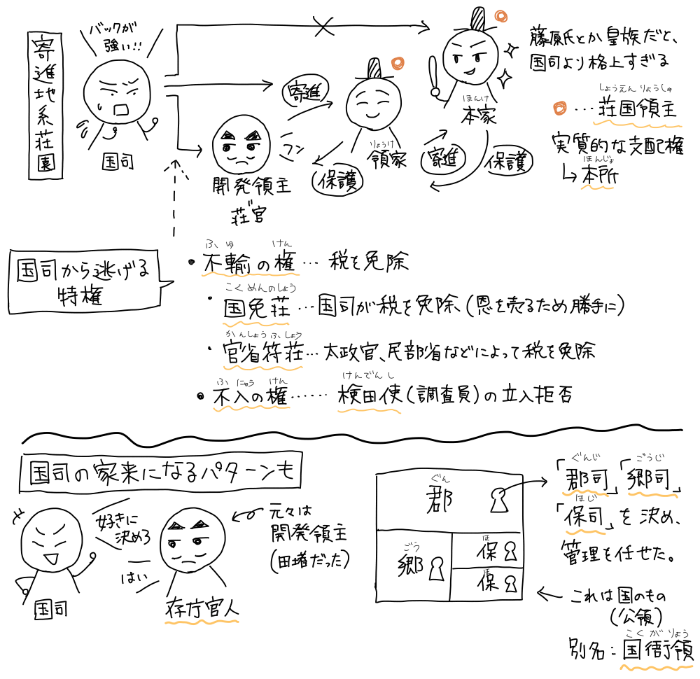 上にめっちゃ偉い人、真ん中に国司とか中級貴族、その下に開発領主、さらに下に下級農民みたいな構図は、荘園も公領も同じ。
