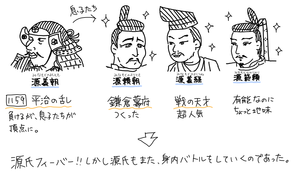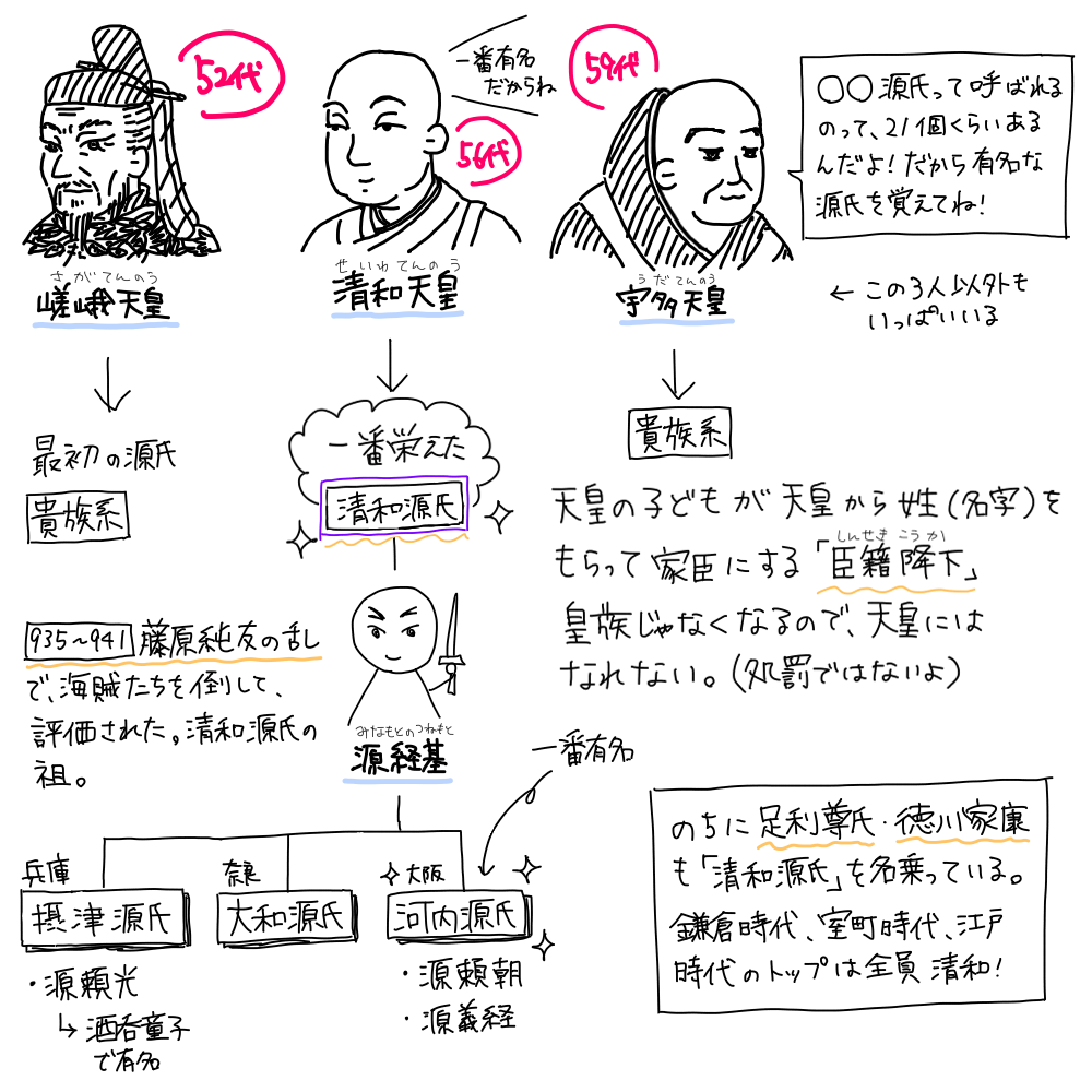 あと後の世で登場する足利尊氏(あしかがたかうじ)、徳川家康(とくがわいえやす)も清和源氏を名乗っており、幕府のトップがみんな清和源氏ですね。
