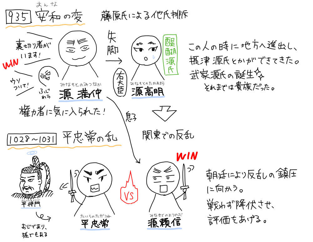安和の変(あんなのへん)の次は平忠常の乱で反乱を鎮圧し、源頼信(みなもとのよりのぶ)は源氏の評価を上げました。