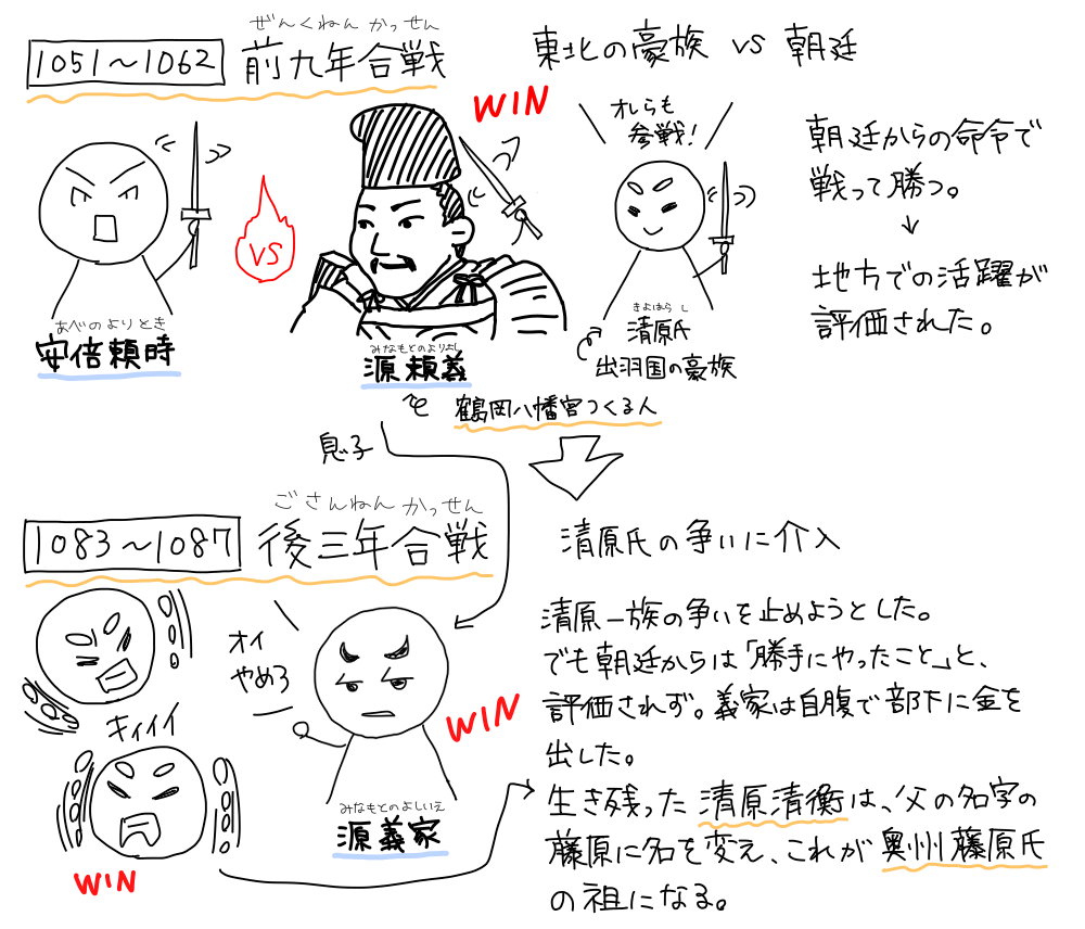 その後清原氏の内紛が始まり、頼義の息子の源義家(みなもとのよしいえ)が仲裁に入りました。
