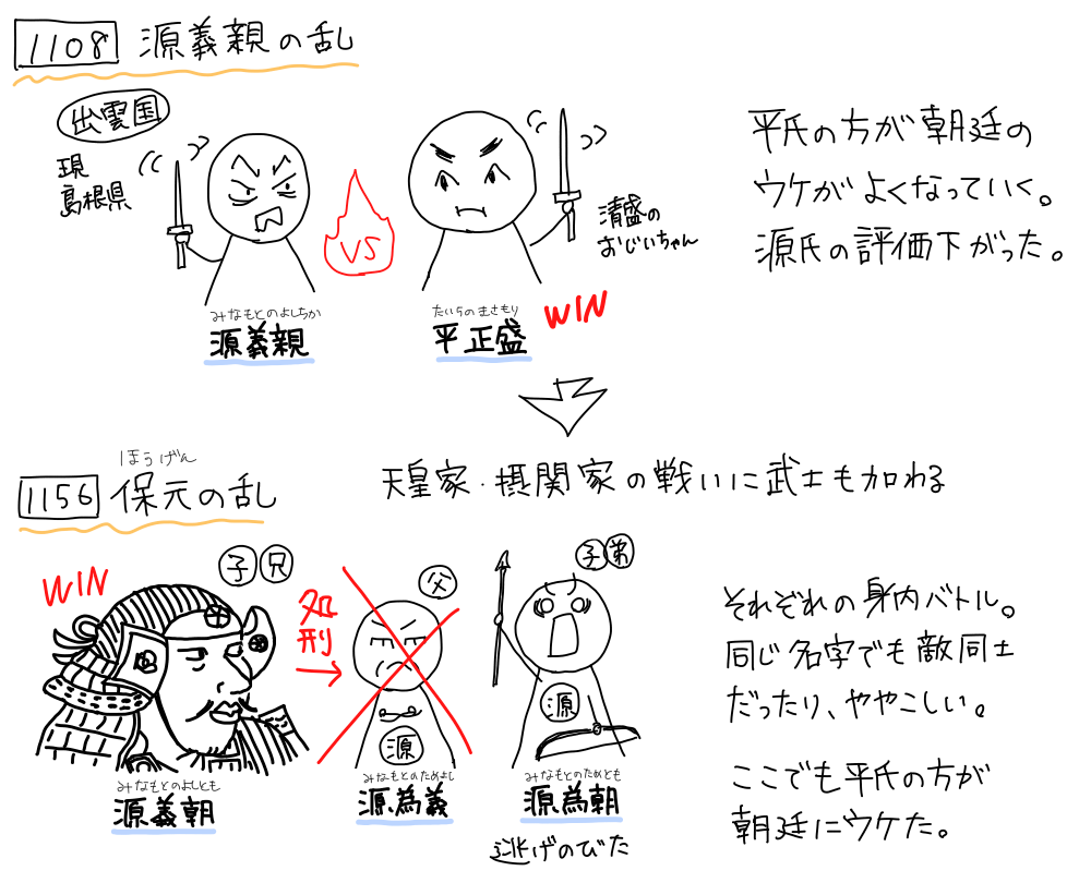 その後保元の乱で源義朝(みなもとのよしとも)は評価を上げますが、同じ源氏内でも争ってますね。