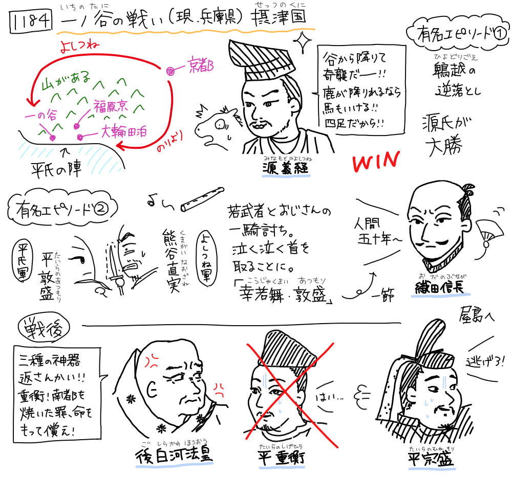 義経の奇襲により、源氏が大勝します。