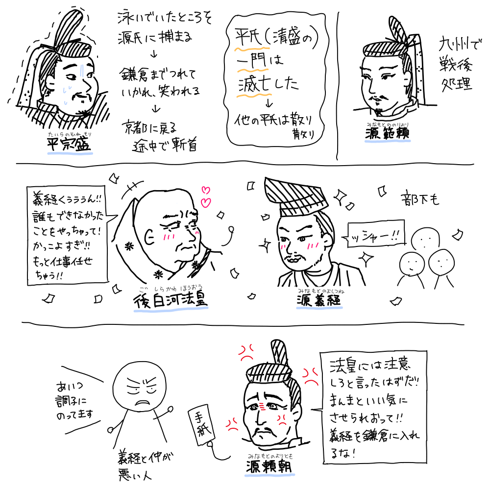 頼朝は鎌倉で次の時代の準備をするので、戦いは弟の源義経(みなもとのよしつね)源範頼(みなもとののりより)に任せます。
