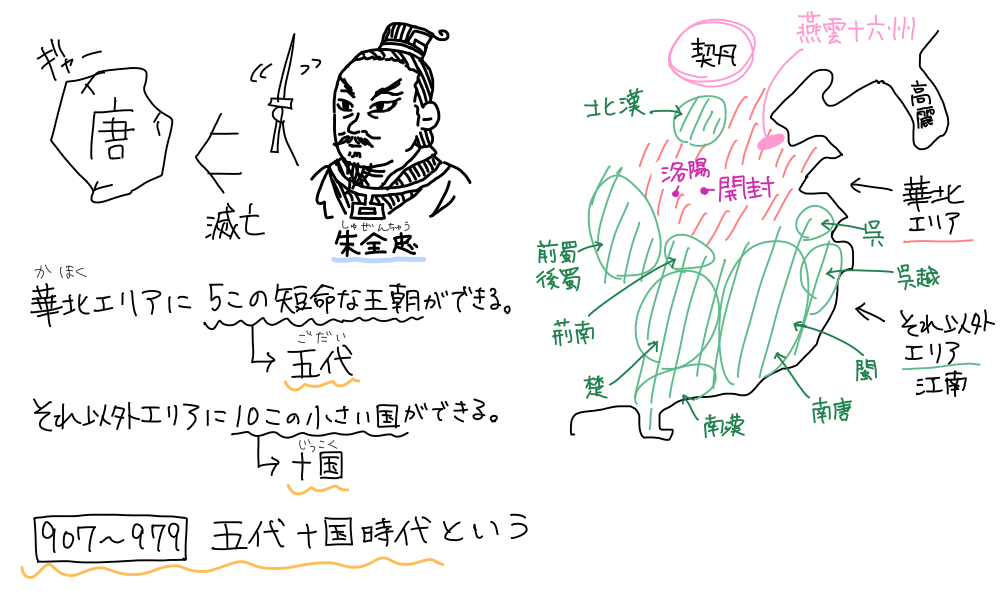 その後は華北エリアで5つの短命王朝、その他のエリアで10この小国ができます。この時期を五代十国時代といいます。