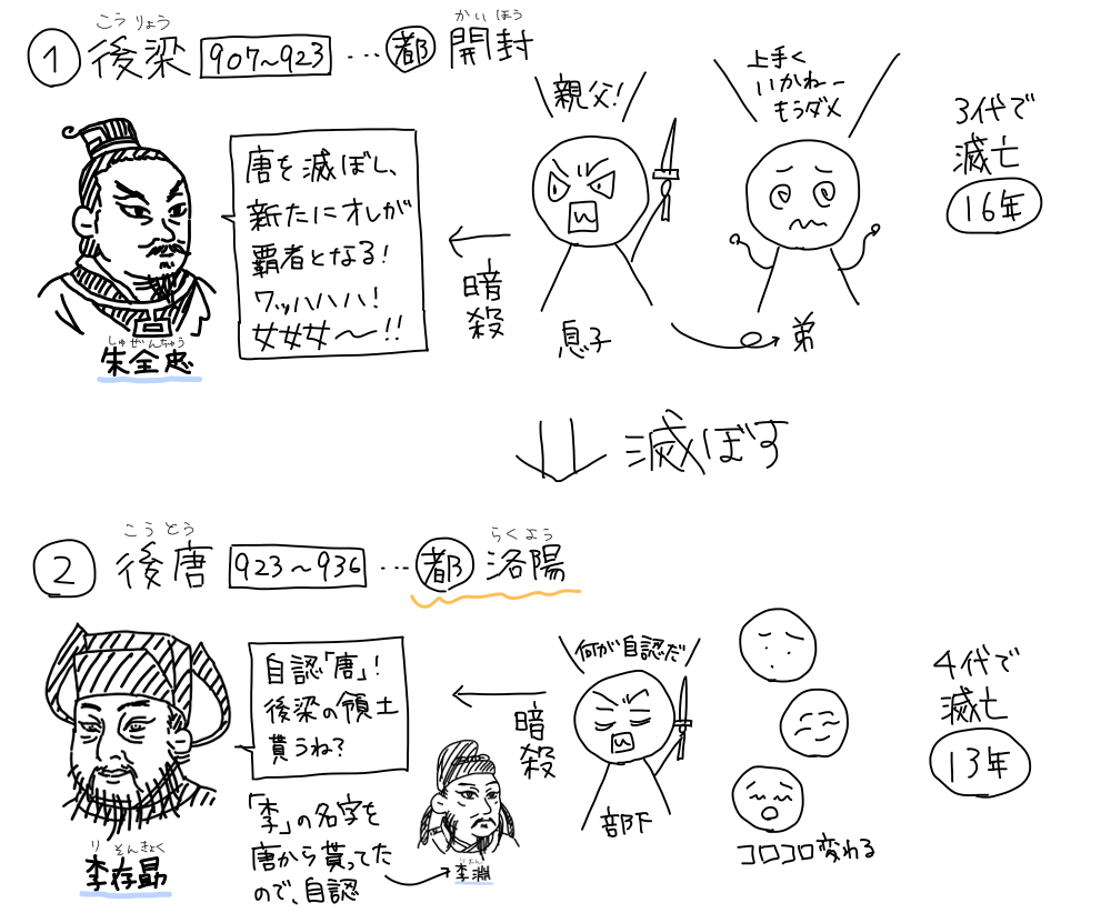 次は後唐(こうとう)。李存勗(りそんきょく)は朱全忠のライバルの息子で、唐の時に「李」の苗字を貰ったので、唐を自認して後唐と名乗りました。