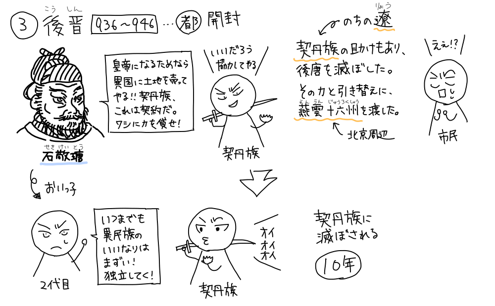 次は後晋(こうしん)。後唐では節度使をしておりました石敬瑭(せきけいとう)が初代です。