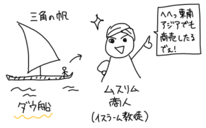 それはどっかの国が侵攻してきたとかではなく、ムスリム商人による交易で広がっていきました。