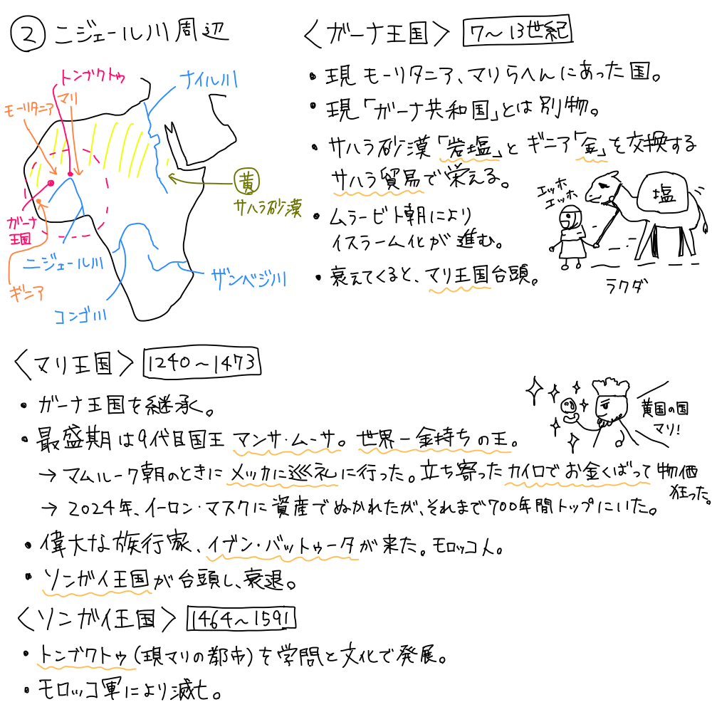 最盛期の王はマンサ・ムーサ。世界一金持ちの男でしたが、つい最近イーロン・マスクに抜かれました。2人ともアフリカ大陸出身です。