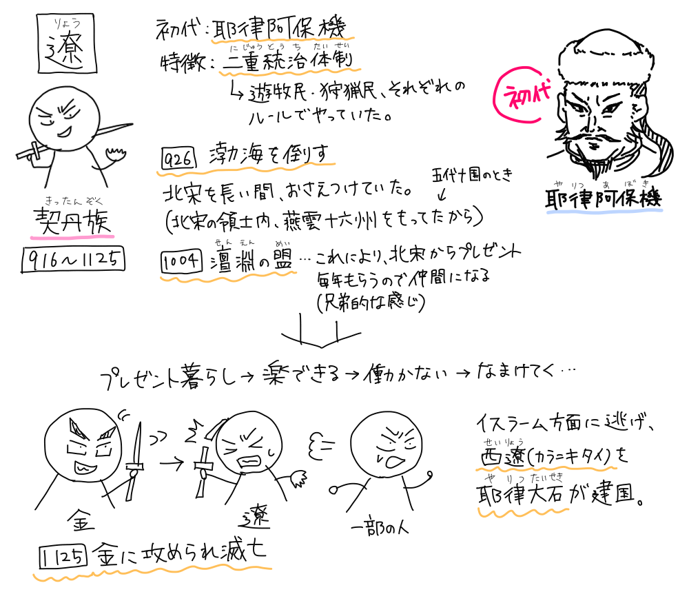 生き残った一部の人は、イスラーム世界に逃げ込み、カラ=キタイ西遼(さいりょう)という名前の王朝を建てます。耶律大石(やりつたいせき)が初代です。